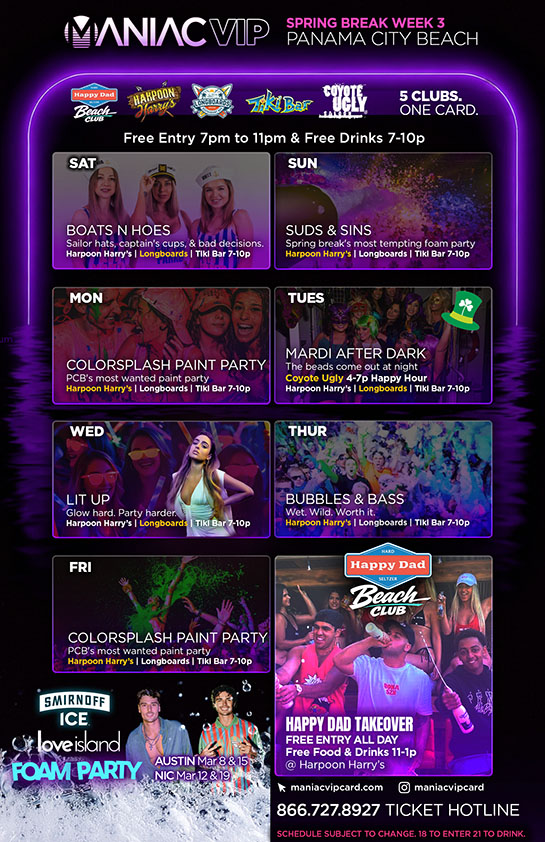 - Free Entry to Harpoon Harry's, Happy Dad Beach Club, Longboards, Tiki Bar & Coyote Ugly